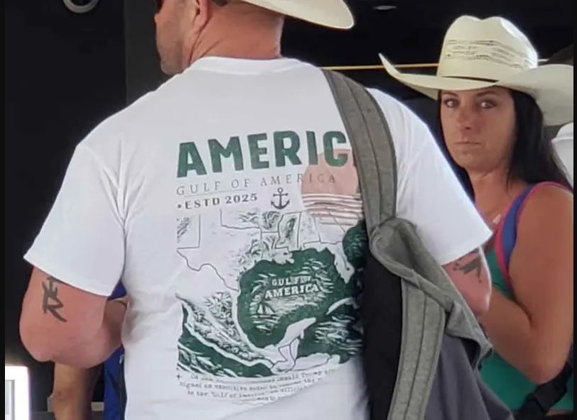 La razón por la que esta foto se popularizó se debe a que estaba vistiendo una playera con el mapa de México y el mapa del Golfo de México, pero con el nombre “Golfo de América”, como Donald Trump, presidente estadounidense instauró llamarle en su país.