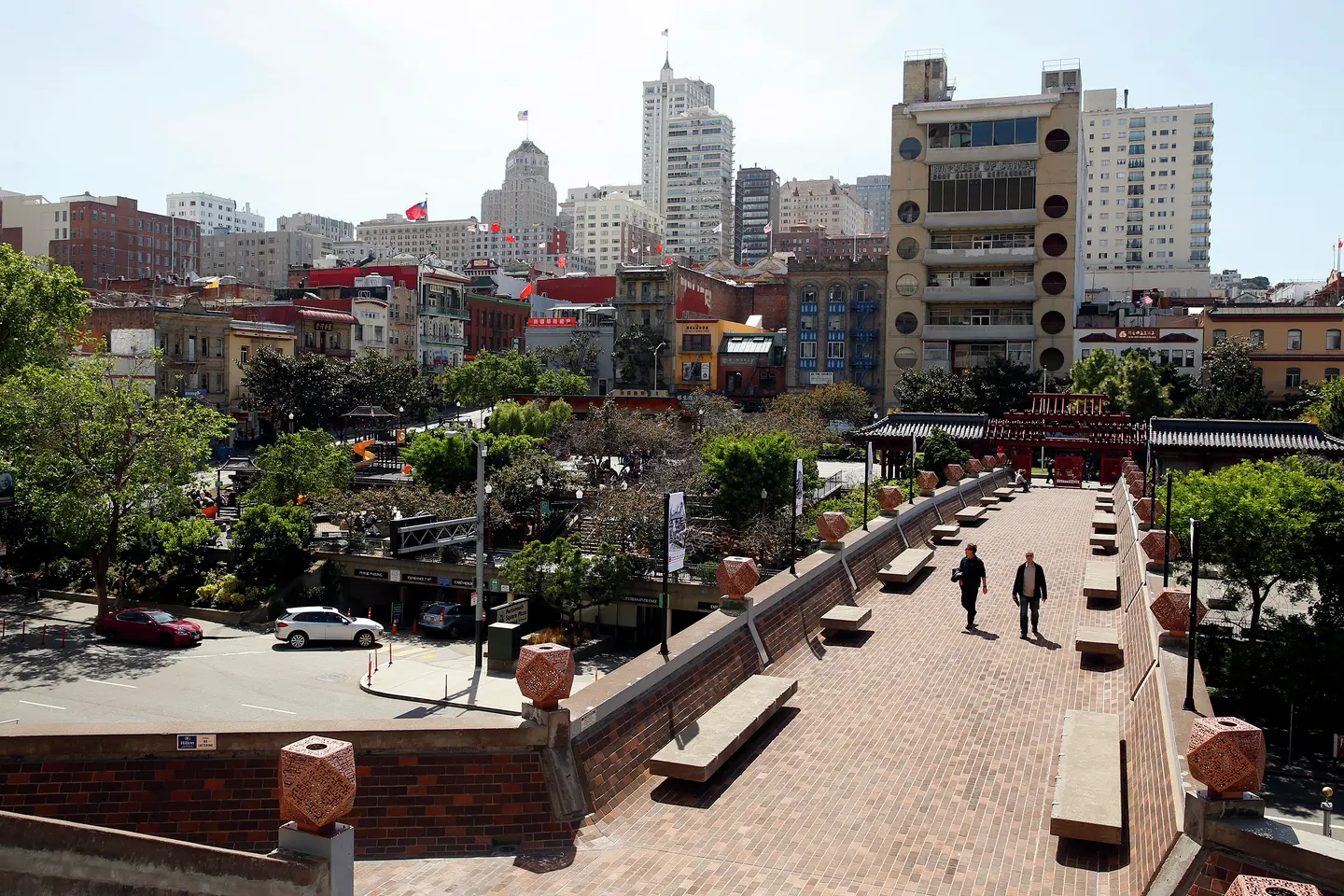 El puente fue diseñado por un equipo de arquitectos que incluía a Clement Chen, John Carl Warnecke y Chen Chi-Kwan. En lugar de replicar el estilo de otras estructuras del barrio chino, el equipo optó por un aspecto moderno y brutalista, como estaba de moda en aquel entonces, mezclando la influencia china con el futurismo del hormigón. ( La Catedral de Santa María , la iglesia de la ciudad con paredes de hormigón, se terminó de construir en la misma época). Clement Chen declaró entonces al San Francisco Examiner que el puente era “el punto fuerte del diseño”.